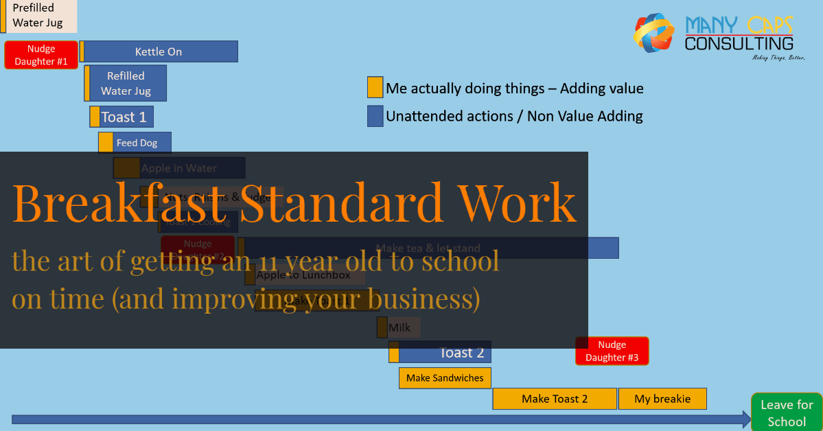 What I have here then is a standard work structure for making breakfast in my house. There are times when I need to do stuff, an order I need to do it in which then results in a pretty predictable outcome (note that for full disclosure we I will agree that the daughter is a variable that is hard to account for, parents you know what I mean here).
