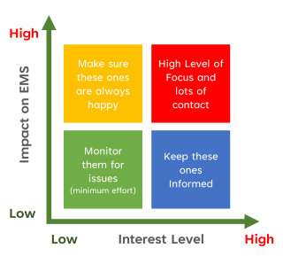 By plotting your interested parties onto a grid like the one shown here, you can create a good understanding of how much they impact your systems and how much time you need to put into managing them. As a starting point it's good to put up the groups as listed above on a wall and then add each of the interested parties into one of them by adding them there using a post-it note, then you can work through each group in order. The result should be a table like that shown below, where you can outline each stakeholder and their interests and expectations on your organisation and products with respect to your ISO14001 Environmental management System.