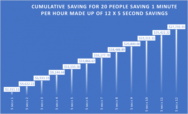 What if you could find a 5-second saving that you could make every hour? that doesn't sound hard now doesn't? Ok, now find another, and another and, well you get the idea. It actually doesn't take long to mount up to saving a whole minute.