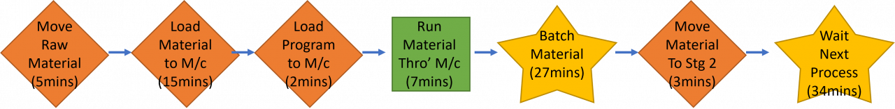 Our client achieved an analysis of their product within 2 hours using the Product Path Diagram approach in a great simple, visual way that pointed them in the right areas to focus on in a way that you just wont get from a Value Stream Map, well, not quickly anyway. Within two hours we have a process-by-process analysis and a complete product Path drawing and a realisation of just how much unproductive time there was that could be reduced. Just think, if you could remove only 50% of the Non-Conversion or Delay time, in this process step that would be 43 minutes saved or avoided, you can't speed up the actual conversion process to get the same result, what you could do it make quit a bit more of the product with all that extra time, if your customer needs them.