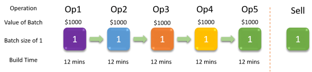 Here is a visual, so if you keep the numbers simple say you only build 5 widgets at a time, each widget takes an 12mins at each operation and you batch in groups of 5 so it's an hour per operation (since this is a mystical process with perfectly balanced operations)